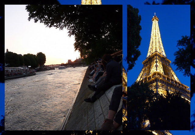 Az utolsó párizsi délutánra/estére egy nyugis szajna parti üldögélős, naplementés pikniket, valamint éjszakai városnézést terveztünk. Ahogy már korábban is láttuk a párizsi fiatalok (és a túristák is) imádják a Szajna partját. Délelőtt, délután, este százával üldögélnek a kis szigeteken, a partokon. Beszélgetnek, iszogatnak, esznek, nézelődnek....ott élnek (ez mint megtudtuk Tamástól annak is köszönhető, hogy egy átlagos francia pár 35 m2-es lakásban lakik, de nem ritkák a 10-15 m2-es kis lakások sem, így nincs mit tenni, a barátokkal a parton és kávézókban találkoznak).